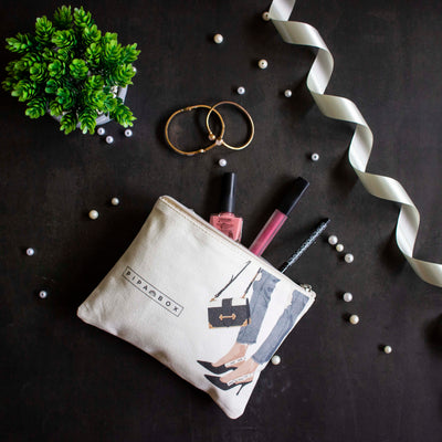 A canvas pouch with a minimal print with a fashion illustration. These canvas pouches are light, spacious and environment friendly. These canvas pouches are light, spacious and environment friendly. Handcrafted in India from unbleached canvas these pouches are low maintenance yet are a statement in themselves.