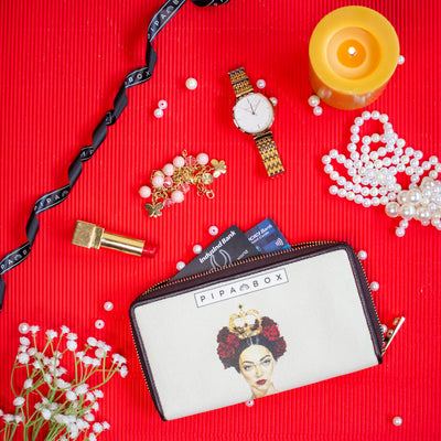 This multi-purpose ladies' wallet is a stylish blend of high-quality canvas with a vibrant digital print and genuine leather trims, both inside and out. Handcrafted with attention to detail, it features premium zippers and hardware for durability and elegance.