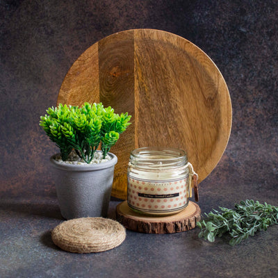 A jar of handcrafted sustainable and organic soy wax candle with an organic and lush fragrance. These are candles minus the side effects and are great for setting the mood. These candles are sturdy,in a good quantity and great with the aesthetics.