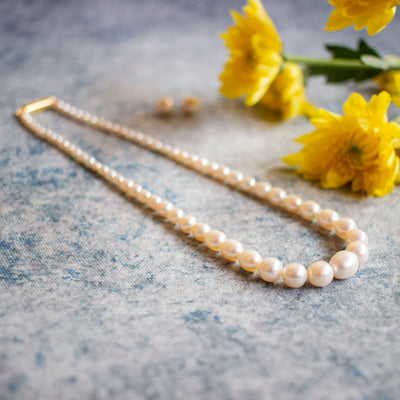 Elevate Your Elegance with the Charlotte Pearl Set. This timeless ensemble features a classic string of graduated freshwater pearls, handcrafted to perfection. Each pearl, a testament to nature's artistry, radiates a luminous glow. The accompanying pearl studs, meticulously crafted in India, complement the necklace beautifully. Together, they create a sophisticated and luxurious look that will endure for generations.