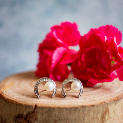 Embrace the Lunar Charm with the Luna Pearl Studs. These classic studs feature a moon-inspired design, adorned with freshwater pearls. The handcrafted silver finish adds a touch of sophistication, making them a versatile accessory for any occasion.